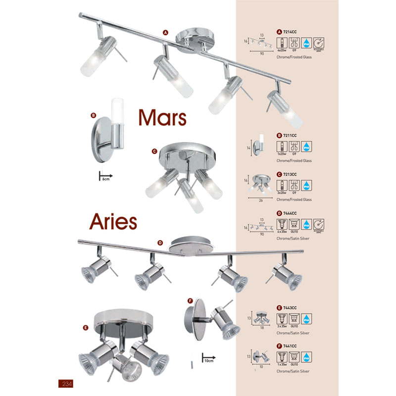 Осветително тяло - спот Aries със стилен и изчистен дизайн, изработен от метални основа, рамена и подвижни глави с покритие от хром и сатенирано сребро. Осветителното тяло може да се монтира като аплик или плафон. Производител Searchlight, Англия.