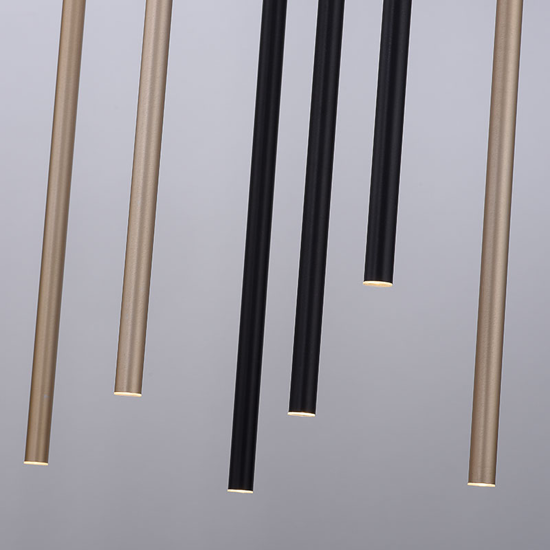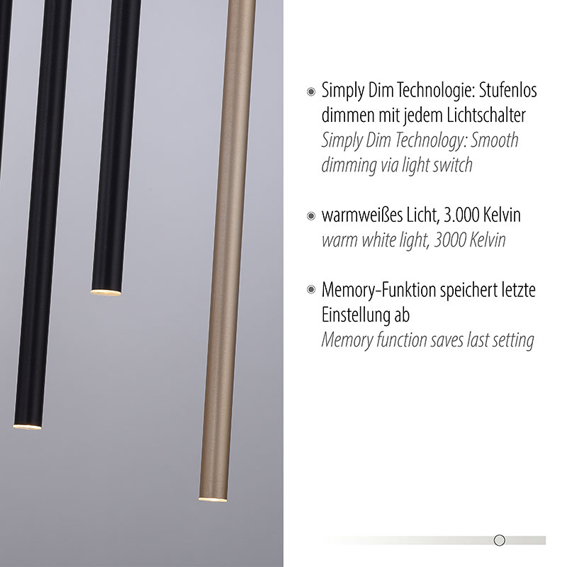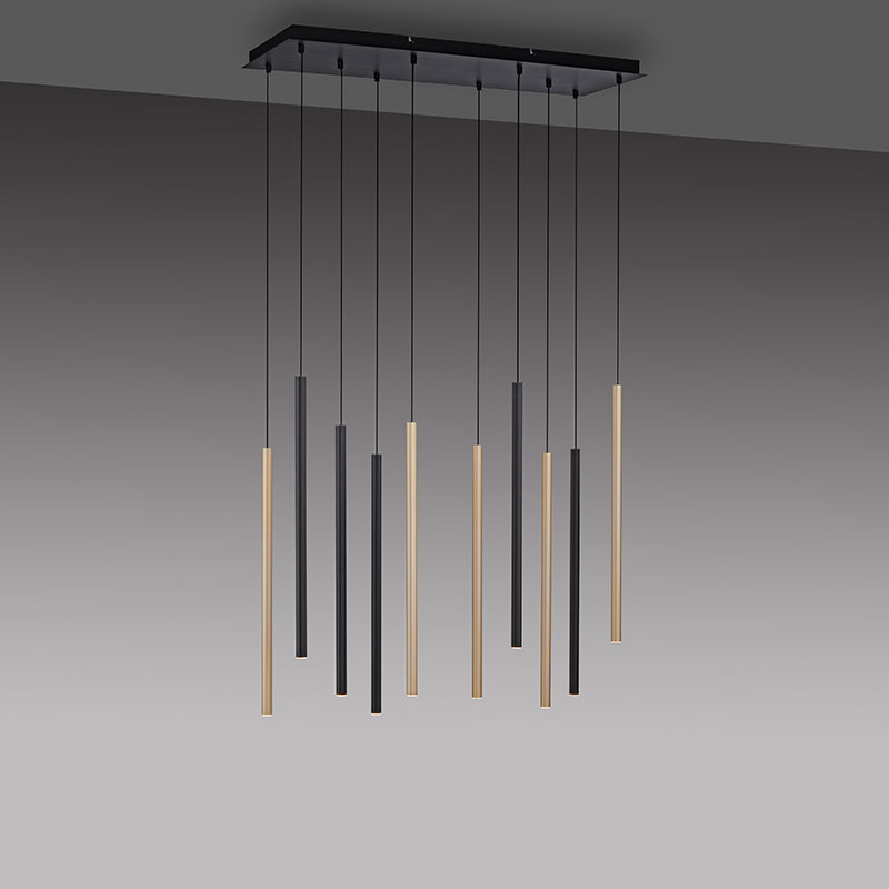 LED линеен полилей в модерен минималистичен дизайн. Той предлага елегантност и функционалност, съчетани в едно. Полилеят разполага с десет индивидуални тръби в черно и златно, всяка от които е с LED модул, който излъчва топло-бяла светлина. Тази комбинация на цветове и форми създава изключителен визуален ефект. За удобство и контрол, полилеят разполага със Simply Dim технология, която позволява димиране на светлината чрез ключа на стената. Този метод на димиране е интуитивен и позволява плавна регулация на интензитета на светлината от 100% до 10%. Технологията също така предлага функция за запазване на последната настройка, което е удобно при повторно включване на светлината. Полилеят е подходящ за монтиране върху вашата маса за хранене или във всекидневната. Линейната висяща лампа със сигурност ще се превърне в акцента на стаята. Производител Paul Neuhaus, Германия.