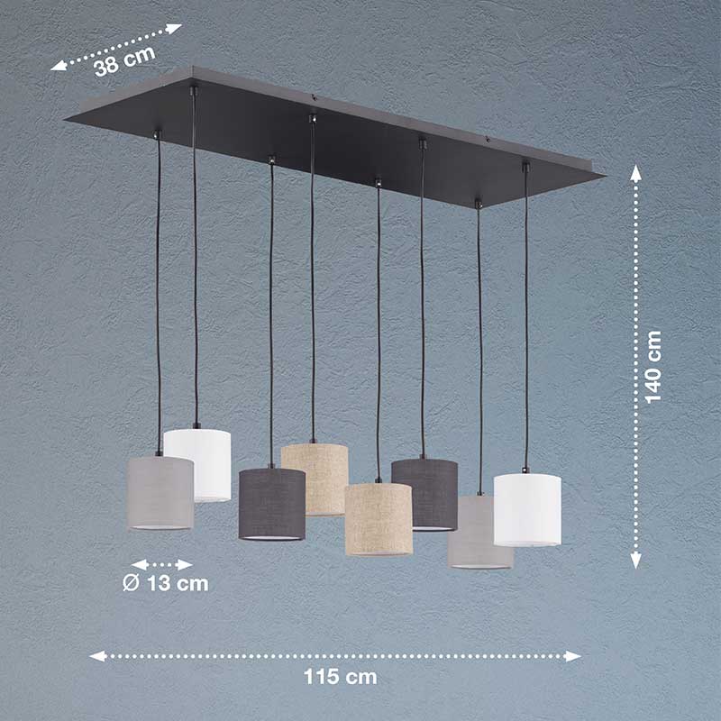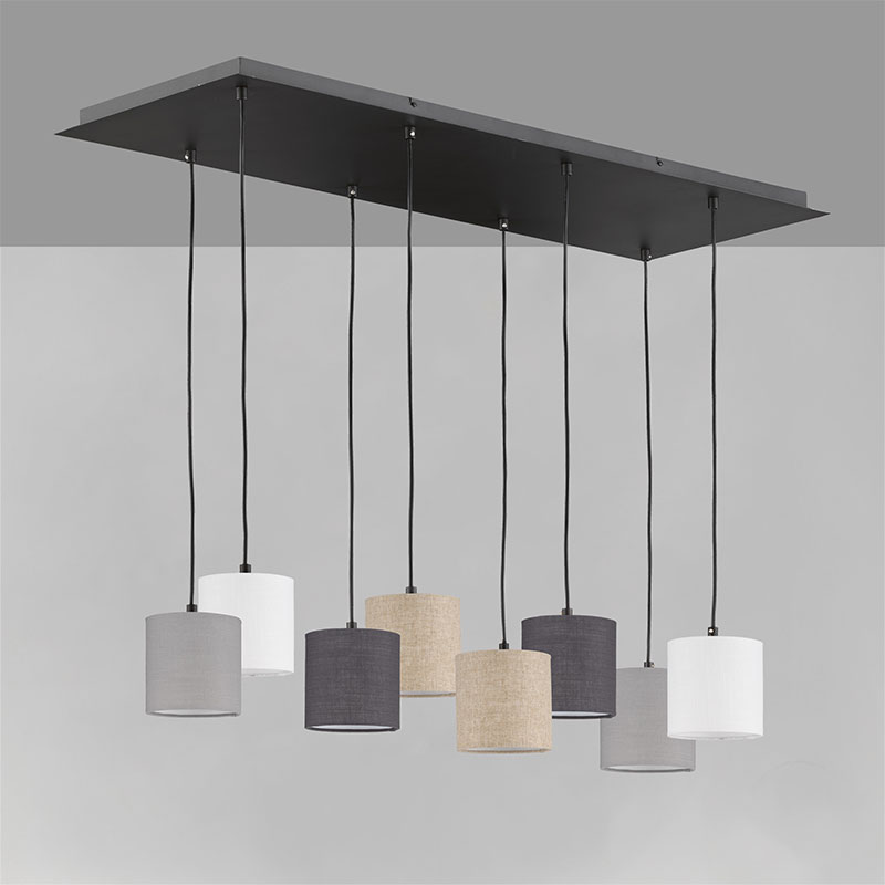 Линеен полилей Isko, изработен от метал в черен цвят с текстилни разсейватели в различни нюанси – бяло, светло сиво, тъмно сиво и бежово. Висящата лампа е с осем светлоизточника, които създават топла и уютна атмосфера за споделени моменти с близки и приятели. Осветителното тяло се предлага без крушки, с фасунги с цокъл Е14.
