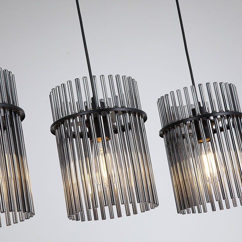 Абажурите са оформени от вертикални стъклени елементи в опушен нюанс, които създават стилен визуален ефект и придават дълбочина и характер на пространството.