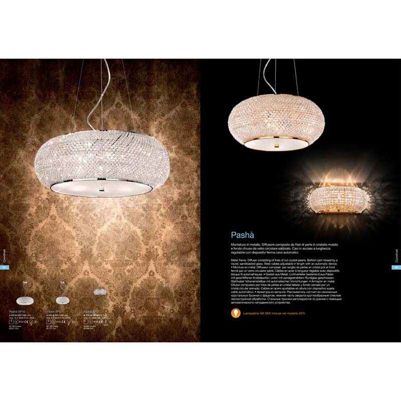Полилей от серия осветителни тела Pasha със стилен дизайн. Изработен от метална рамка с хромирано или златно покритие и дифузер, изработен от нанизи кристални перли, затворен от долната страна с кръгло матирано стъкло. Производител Ideal Lux, Италия.