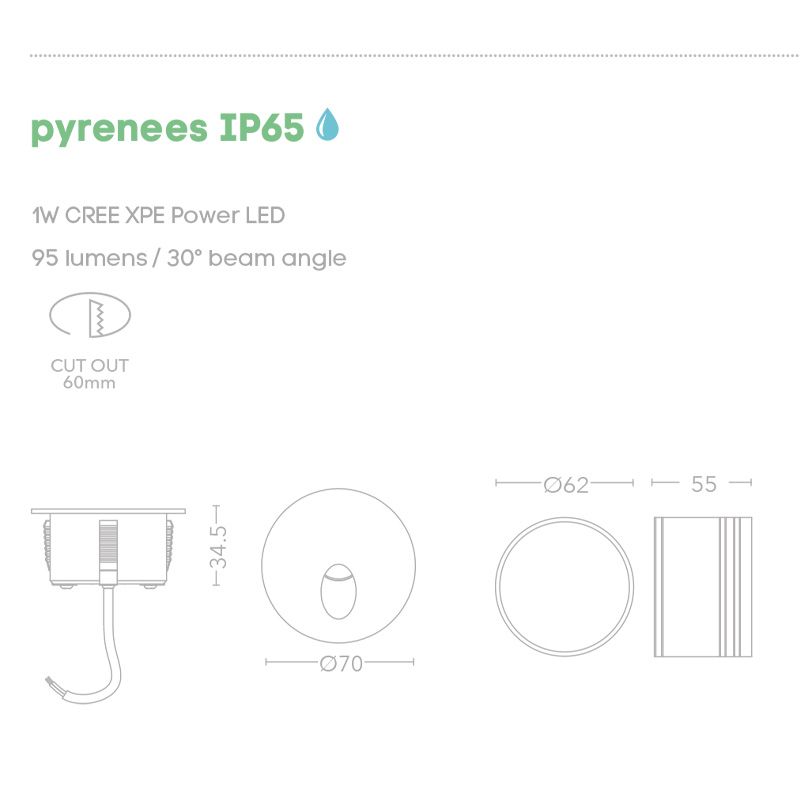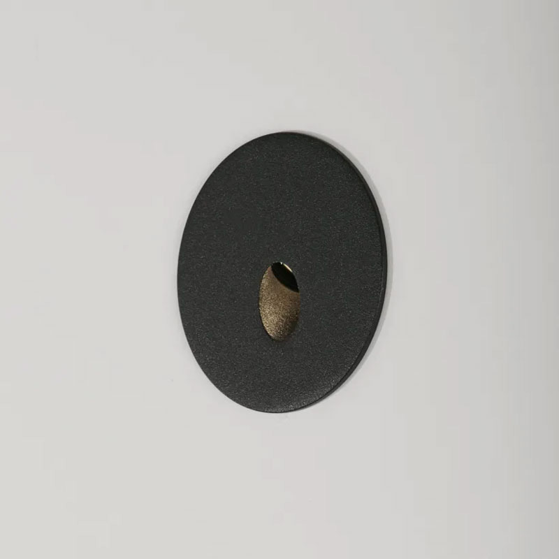 Луна за вграждане в стена Pyrenees IP65, изработена от алуминий в черен цвят с кръгла форма. Осветителното тяло се предлага с вграден 1W CREE LED модул, който излъчва топло - бяла светлина (3000K) и създава кръгъл лъч светлина върху повърхността под нея. LED модулът работи с директно захранване 220-240V.
