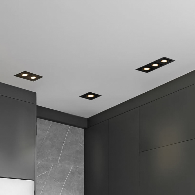 Луна за вграждане Grid 2, изработена от алуминий в матиран черен цвят с форма на правоъгълник и минималистичен дизайн. Лампата за таван се предлага без крушки, с фасунги GU10 (максимум 10W LED всеки), което ви позволява да изберете светлоизточници според вашите предпочитания и желаната светлинна концепция.