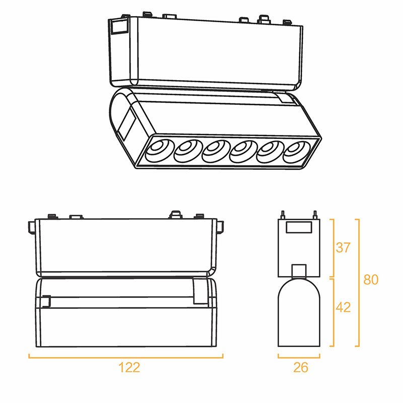 Магнитният осветител се отличава с характерния си грил дизайн и уникална подвижна конструкция, която позволява прецизно насочване на светлината. Осветителят е с гъвкав механизъм за завъртане, който ви дава възможност да насочите светлинния лъч точно там, където е необходимо - за акцентиране на произведения на изкуството, продукти в магазини или за създаване на специални светлинни ефекти. Светлоизточниците са разположени в линейна конфигурация за оптимално разпределение на светлината.