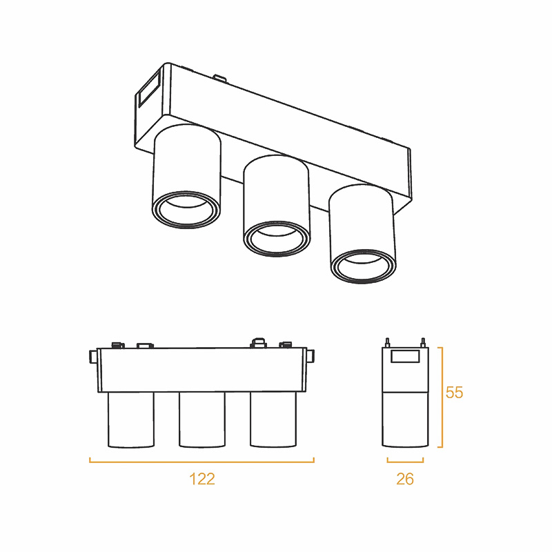 Магнитният осветител се отличава с уникален троен дизайн, който включва три компактни цилиндрични тела, тип луна, осигуряващи концентрирано и насочено осветление надолу. Triple DOWNLIGHT дизайнът създава три фокусирани светлинни лъча, идеални за осветяване на по-голяма зона или за акцентиране на няколко обекта едновременно. Линейното разположение на трите осветителя осигурява равномерно покритие в дължина. Осветителят се поставя и плъзга лесно по магнитната шина благодарение на иновативната магнитна система за закрепване - без инструменти, без сложни манипулации.