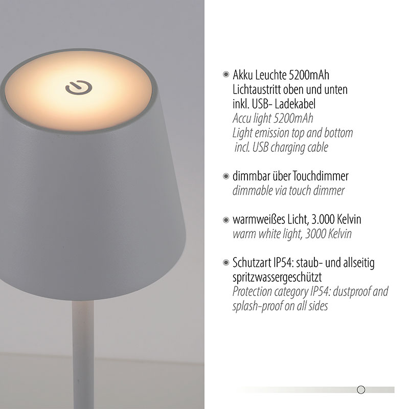 Настолна градинска лампа Euria с USB зареждане и включени батерии. С кръгла форма и тънък дизайн, тази лампа привлича вниманието и придава стил на вашия интериор. Тя е оборудвана със сензорен димер, който ви позволява лесно да регулирате яркостта на осветлението. Това означава, че можете да създадете идеалната атмосфера за различни ситуации, като четене на книга, работа на бюрото или романтична вечеря за двама. Затъмняването улеснява настройването на настроението в стаята. Лампата има клас на защита IP54, което означава, че е защитена от прах и пръски вода. Това я прави подходяща както за вътрешна, така и за външна употреба, например на терасата или балкона. С вградената батерия можете да я използвате независимо от източник на захранване, като наслаждавате на приятната светлина, където и да сте. Зареждането от USB ви осигурява удобство и лесно поддръжка.
