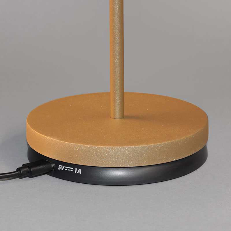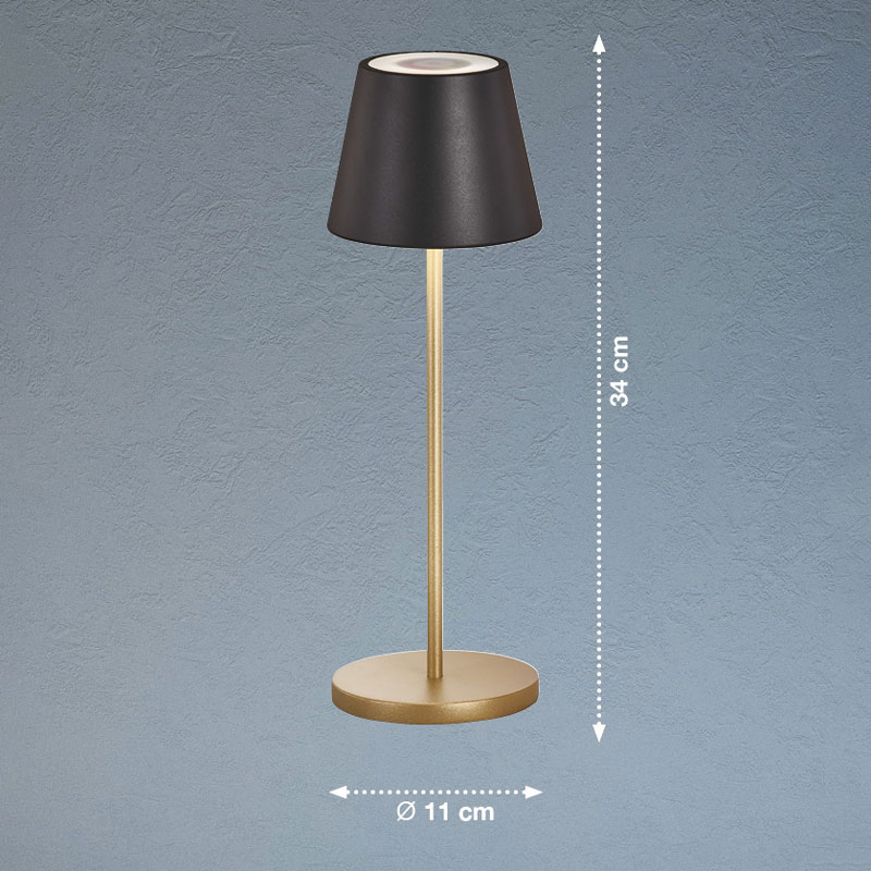 Настолна лампа за градина Cosenza 2.0 с батерия, изработена от метал в пясъчно-черен цвят със златиста основа. Осветителното тяло е с RGBW модул, позволяващ непрекъснато регулиране на цветовете и бялата светлина за създаване на различни настроения.