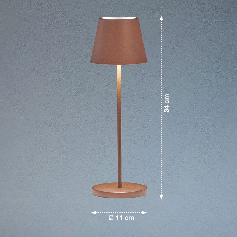 Настолна лампа за градина Cosenza 2.0 с батерия, изработена от метал в ръждиво-кафяв цвят. Осветителното тяло е с RGBW модул, позволяващ непрекъснато регулиране на цветовете и бялата светлина за създаване на различни настроения.