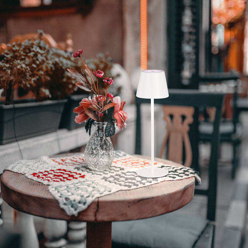 Лампата Viletto е идеална за създаване на интимна атмосфера на масата в градината, на терасата или като допълнително осветление при вечеря на открито. Осветителното тяло се зарежда чрез включения USB кабел и може да се използва и по време на зареждане.