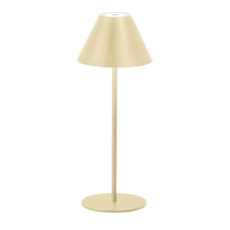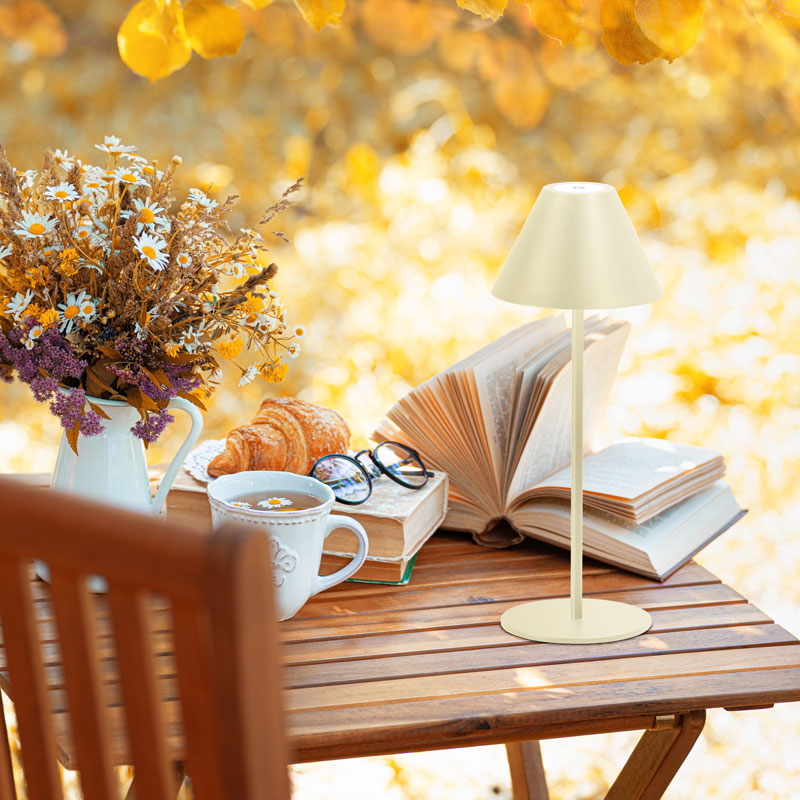Преносимата лампа е със защита IP54 (5 - ограничена защита от прахови частици и пълна защита от контакт; 4 - защитена от пръскане от всички посоки), което я прави идеална за използване както в закрити помещения, така и на открито - в градината, на верандата, на терасата или при къмпинг. Елегантният дизайн с конусовиден абажур придава изискан вид, който се вписва чудесно във всеки интериор или екстериор.