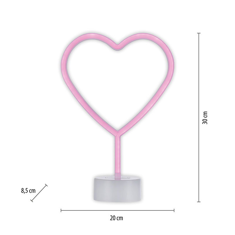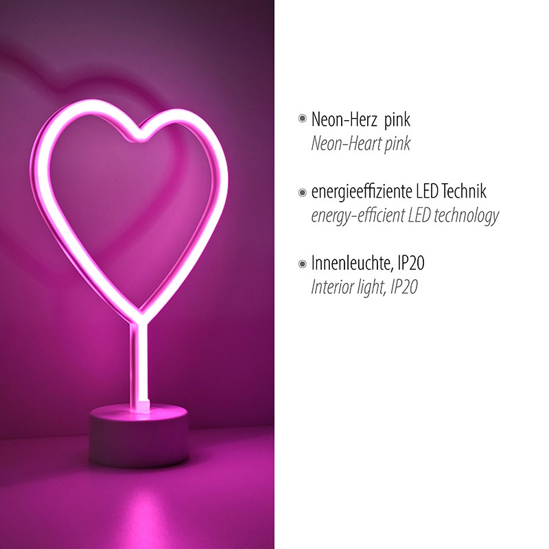 Настолна лампа със светещо неоново сърце. Създайте атрактивна и романтична атосфера към вашата стая. Лампата се захранва от батерии. Моля, обърнете внимание, че батериите не са включени. Имате нужда от 3xAA 1. 5V батерии. С практичния ключ за включване/изключване имате пълен контрол върху светлината и можете да я включвате и изключвате по всяко време, когато желаете. Производител Leuchten Direkt, Германия.