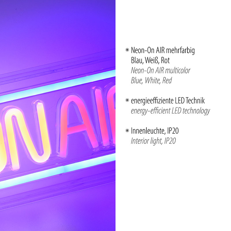 Осветително тяло - настолна лампа с неонов светещ надпис ON AIR. Идеалната декоративна лампа за вашата стая. Неоновата лампа се захранва чрез USB кабел. Кабелът е включен. Всичко, от което се нуждаете, е стандартно захранване. Енергоспестяващият LED източник на светлина кара надписа да блести в ярки цветове. Неоновата светлина е много здрава и лесна за инсталиране благодарение на акрила. Независимо къде е закрепен, той осигурява страхотен светлинен акцент. Производител Leuchten Direkt, Германия.