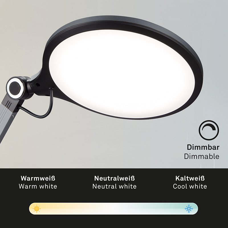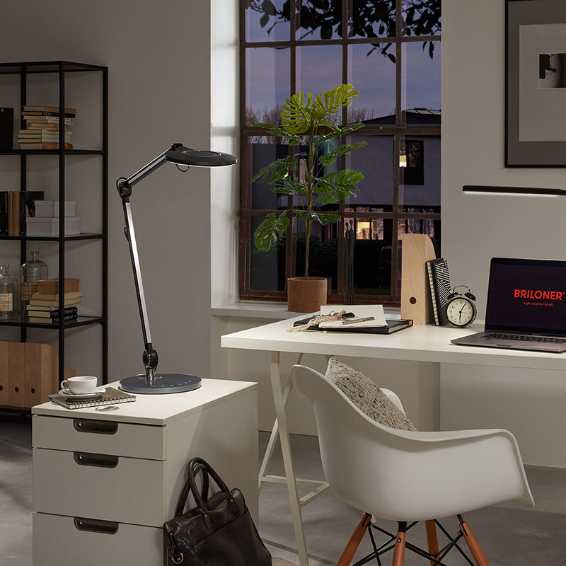 Осветително тяло - лед настолна лампа OFFICE, изработена от метална основа в цвят антрацит и пластмасов разсейвател в бяло. На Ламапата е с гъвкаво рамо и подвижна глава за прецизно насочване на светлината. Основата е със сензорни бутони, чрез които лесно и удобно можете да включвате и изключвате лампата; да регулирате силата на светене - от слаба към силна светлина; да променяте цветната температува на светлината - от топла към студена и обратното. Лампата е идеалното решение за вашия домашен офис. Производител BRILO, Германия.