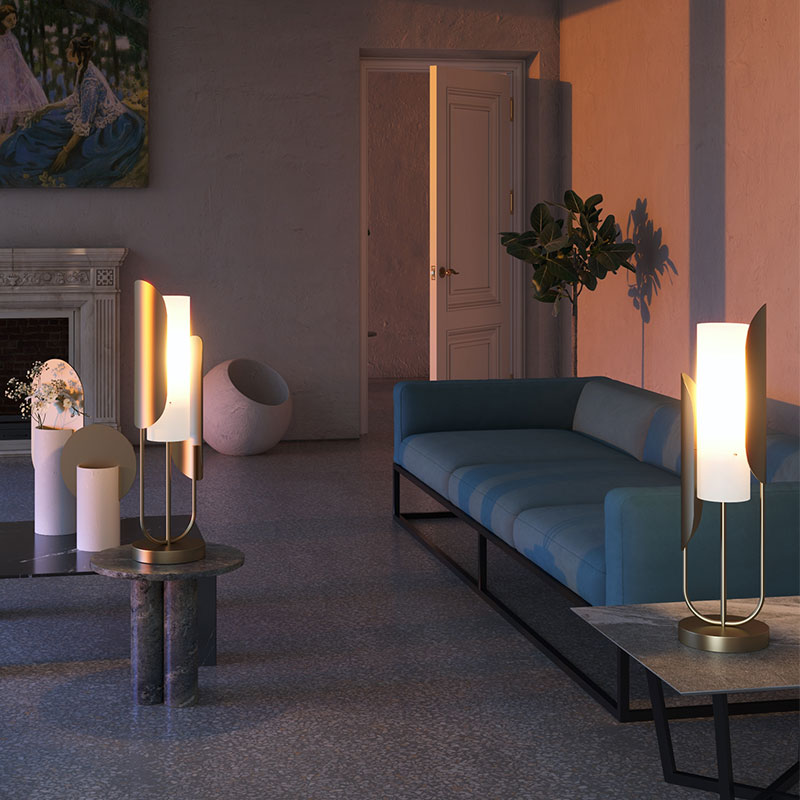 Настолна лампа Cipresso, изработена от метал в златист цвят и цилиндричен разсейвател от бяло стъкло. Модерната асиметрична форма придава характер и динамика, превръщайки осветителното тяло в стилен акцент във всеки интериор.