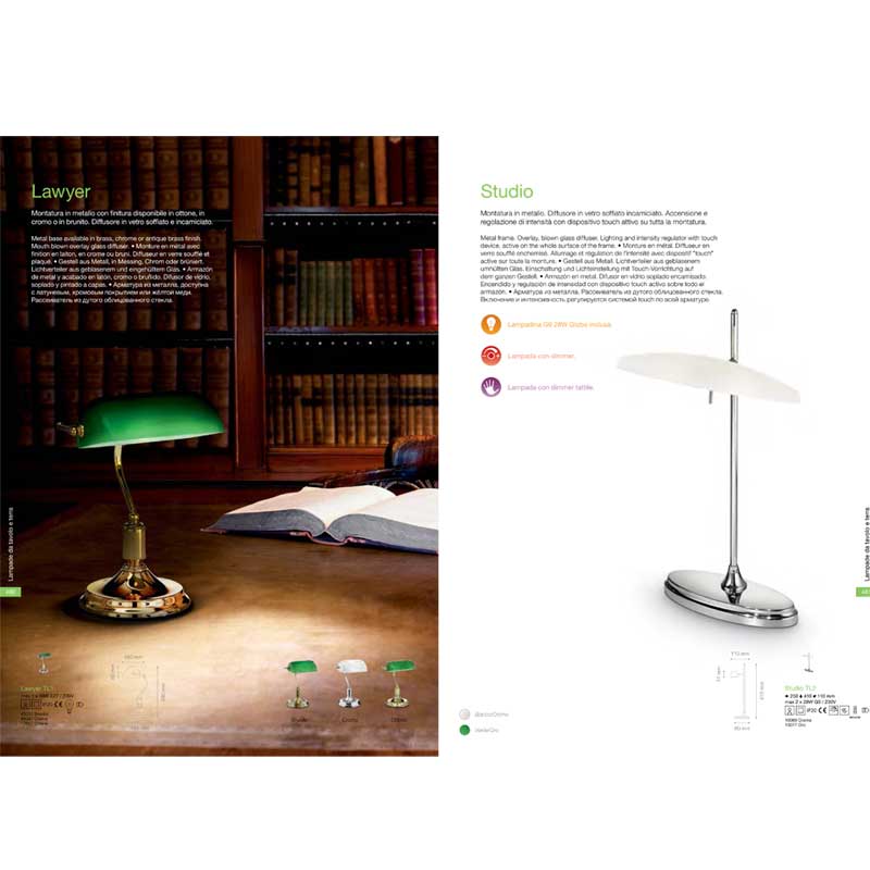 Настолна лампа Lawyer с метална основа с покритие от хром, месинг или състарен месинг и ръчно обработен стъклен дифузер в зелено или бяло. Производител Ideal Lux, Италия.