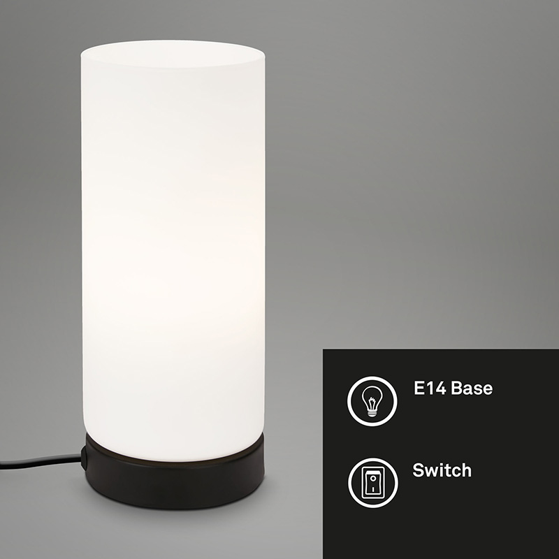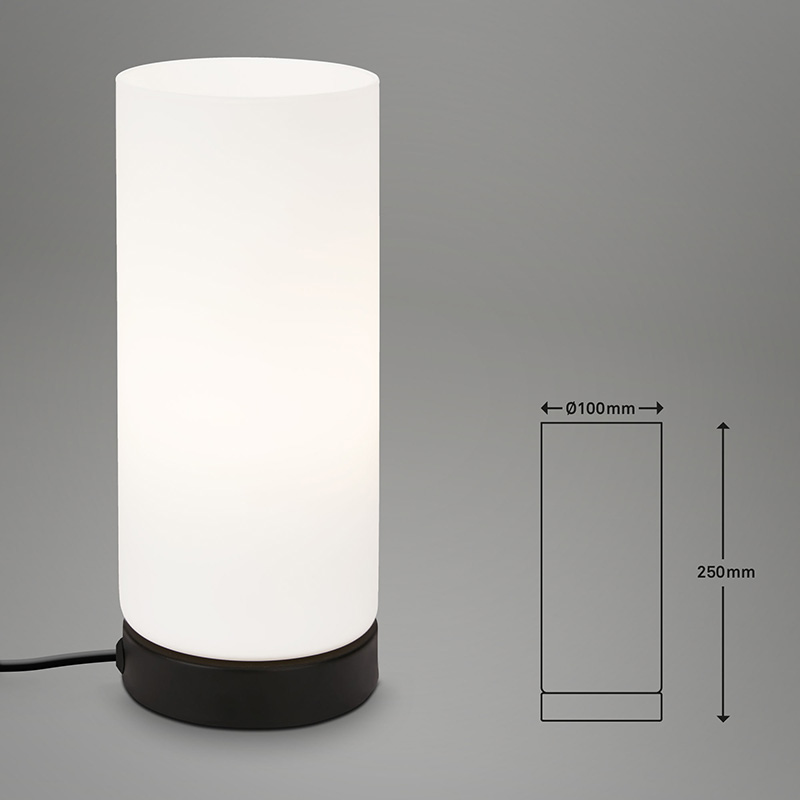 Осветително тяло - настолна лампа PAIPA, изработена от метална основа в черен цвят и разсейвател от бяло матирано стъкло. Кабелът на лампата е с ключе за удобно включване и изключване. Дизайнът на осветителното тяло е подходящ за допълнително осветление за всекидневна, осветление за спалня. Производител BRILO, Германия.