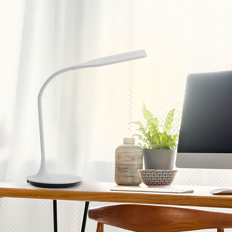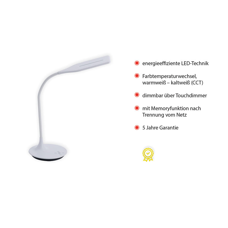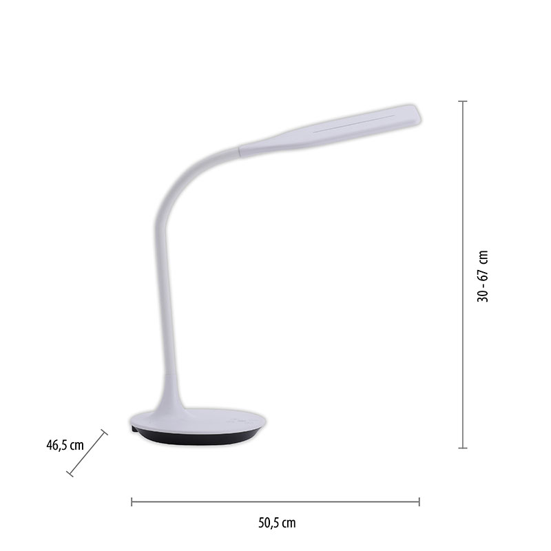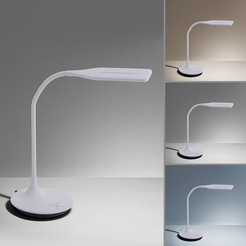Осветително тяло - LED настолна лампа RAFAEL, изработенa от метал в бял цвят и регулируемо рамо за прецизна насоченост на светлината. Артикулът разполага с функция на управление, която дава възможност за променлива настройка на цветната температура от топло бяло до студено бяло; бутон за нощна светлина; светлина походяща за четене; бутон за включване и изключване и бутони за димиране. Благодарение на функцията за памет, може лесно да запазите предварително запазената настройка за следващото включване. Дизайнът на осветителното тяло е подходящ за осветление на всекидневна, осветление на спалня и осветление на офис. Производител Leuchten Direkt, Германия.