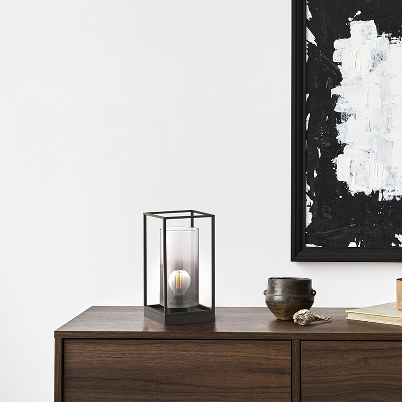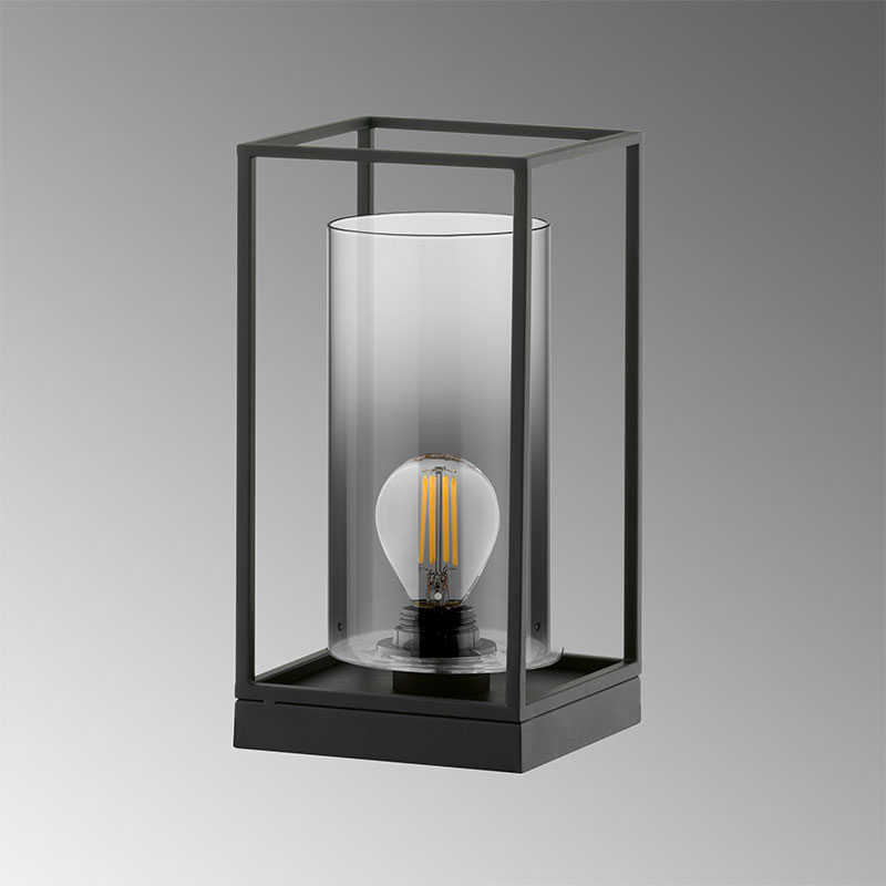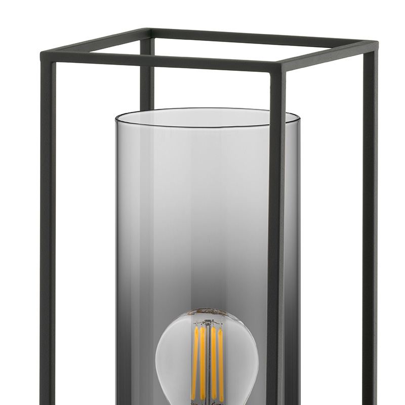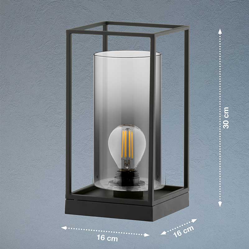 Настолна лампа Samu, изработена от метална рамка в пясъчно черен цвят и разсейвател от опушено стъкло с цилиндрична форма. Модерният дизайн тип фенер с видима крушка в стъкления цилиндър създава стилен индустриален вид на осветителното тяло.
