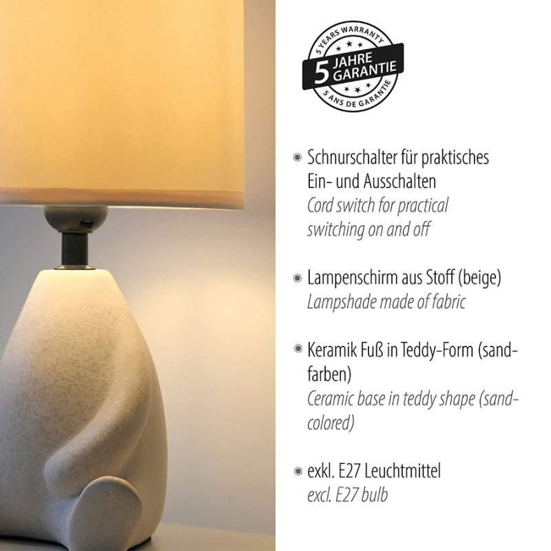 Лампата за детска стая е с удобен кабелен ключ на дължина 150 см за лесно включване и изключване; фасунга E27, което дава възможност за избор на различни видове крушки според предпочитанията ви; очарователна форма на мече, която създава уютна и приятелска атмосфера; мек пясъчен цвят, който се вписва хармонично в детския интериор и не нарушава спокойния сън.