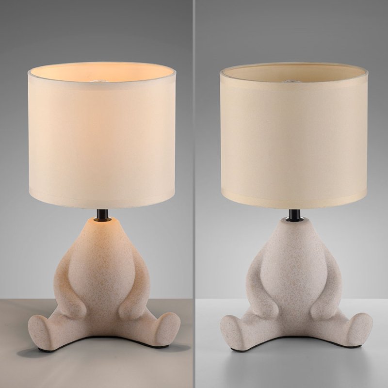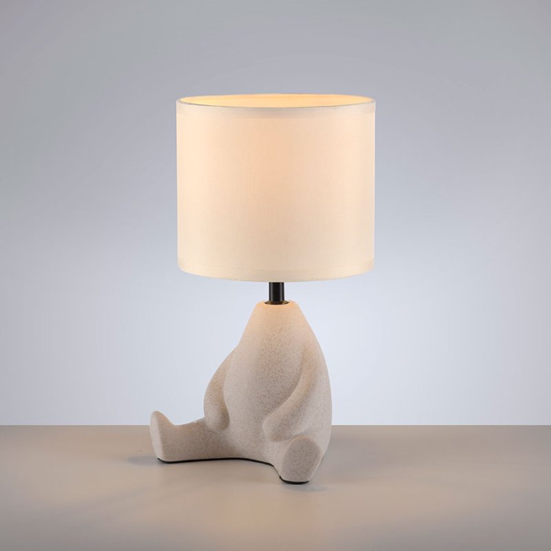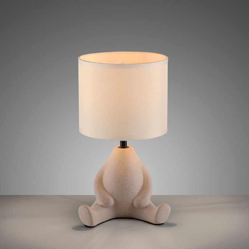 Детска настолна лампа TED, изработена от керамична основа във формата на мече, в пясъчен цвят и текстилен абажур в бежов цвят с цилиндрична форма.