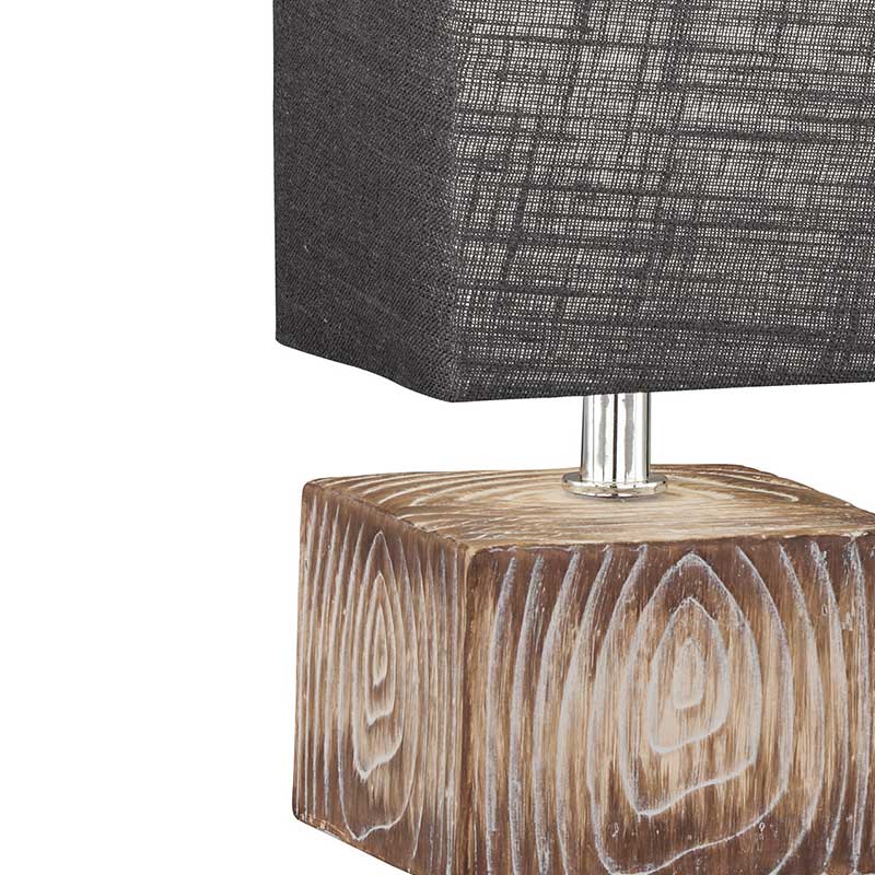Нощна лампа Hanke, изработена от керамика в кръгла форма с покритие, което имитира естествено дърво и цилиндричен разсейвател от текстил в ленено сиво.
