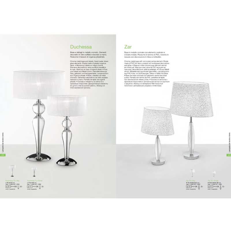 нощна лампа Duchessa с елегантен дизайн, изработена от хромирана метална основа и детайли, ръчно обработени прозрачни стъклени елементи и абажур от плисирана органза. Производител Идеал Лукс, Италия.
