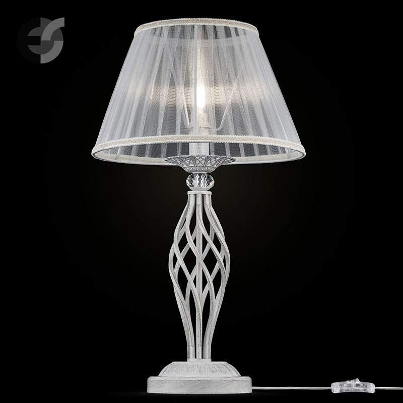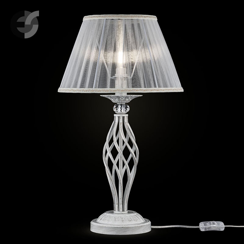 Нощна лампа Grace, изработена от метал в бял цвят с ефект на състарено дърво и абажур от органза със златисти нишки по ръба. Абажурът е с класическа конусовидна форма и разпръсква светлината меко, създавайки спокойна и романтична атмосфера в спалнята.