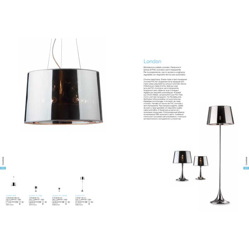 нощна лампа London с модерен дизайн, изработена от хромирано метално тяло и абажур от полупрозрачно хромирано фолио. Производител Идеал Лукс, Италия.
