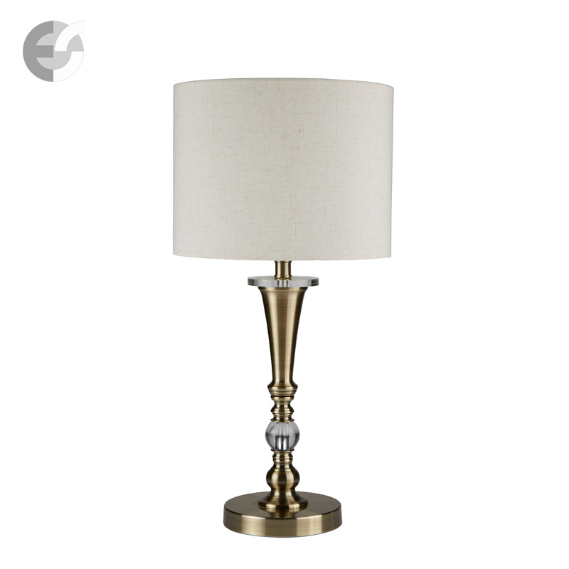 Осветително тяло - класическа нощна лампа, изработена от метална основа в цвят античен месинг и ленен абажур. Подходяща за допълнително осветление за спалня, всекидневна или хотел .Серия осветителни тела DRUM. Производител Searchlight, Англия.