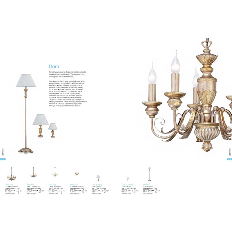 Полиелй във винтидж стил, с тяло, изработено от смола и ръчно изработени метални рамена и декоративни елементи в състарен златист цвят. Серия осветителни тела Dora на Ideal Lux, Италия.