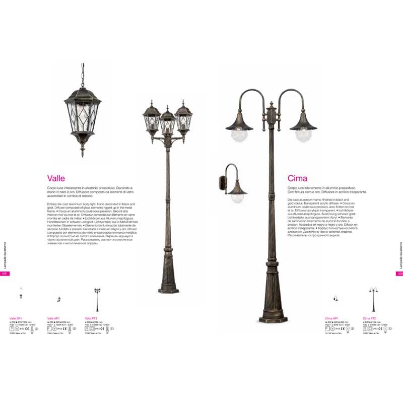 Паркова лампа с излято от алуминий тяло, боядисано в черно-златист цвят, което придава на осветителното тяло приятен състарен вид и прозрачен дифузер от акрил. Серия осветителни тела Cima на Ideal Lux, Италия.