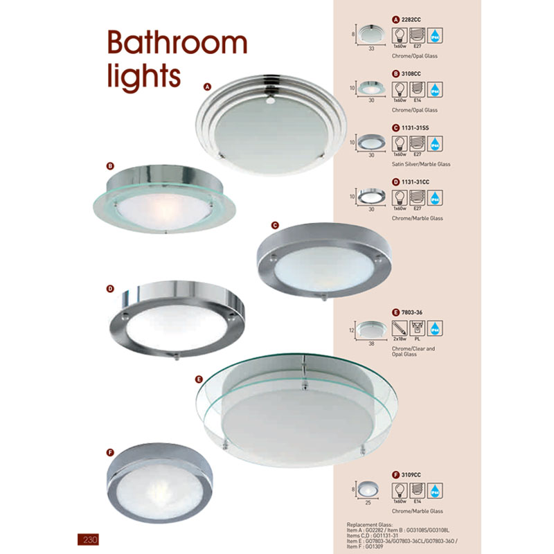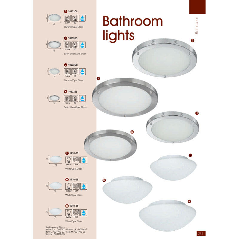 Осветително тяло - плафон с елегантен дизайн, изработен от бяло, матирано стъкло. Серия осветителни тела за баня Bathroom Lights. Производител SearchLight, Англия.
