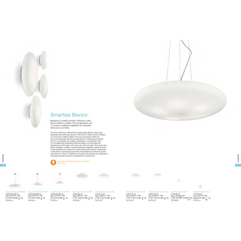 Плафон от серия осветителни тела Smarties Bianco със стилен и изчистен дизайн, изработен от хромирана метална основа и дифузер от бяло матирано стъкло. Осветителното тяло може да бъде монтирано и като аплик. Производител Ideal Lux, Италия.