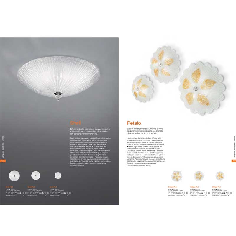 Плафон за таван Shell с ръчно обработен дифузер от прозрачно, гранулирано стъкло и метален държач с хромирани детайли. Осветителното тяло може да бъде монтирано и като аплик. Производител Идеал Лукс, Италия.
