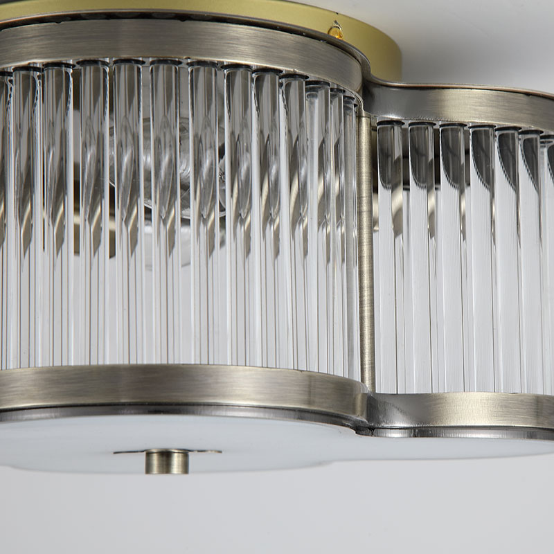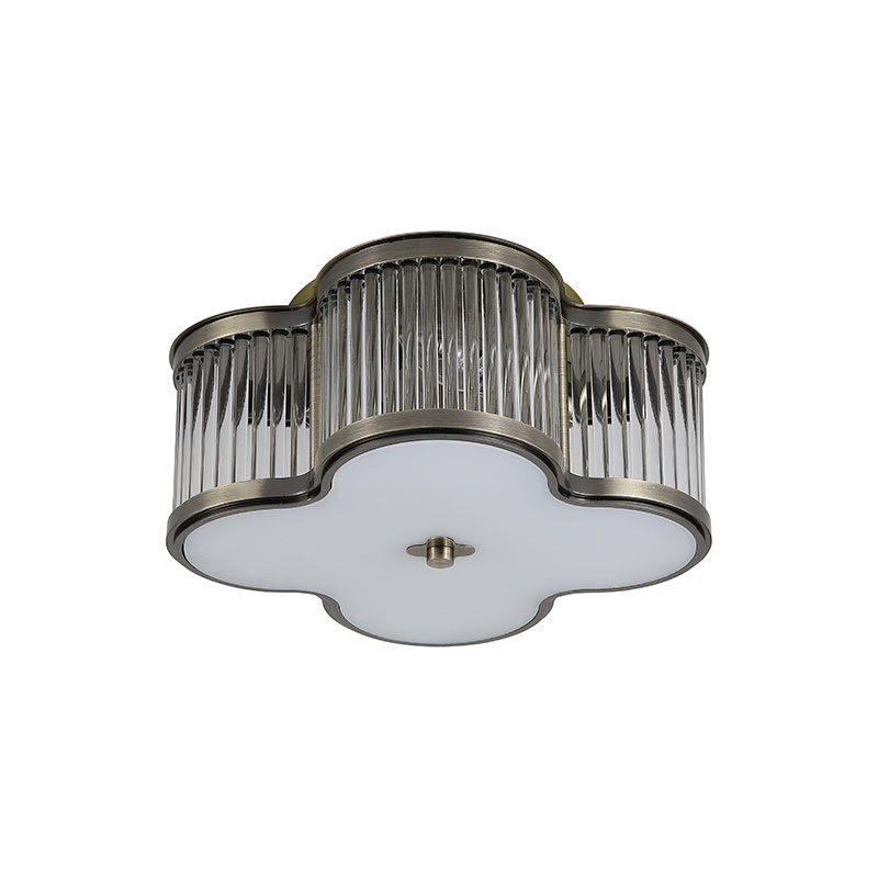 Плафон LOTUS 2Lt е стилно осветително тяло с форма на четирилистна детелина, което впечатлява със съчетаващия се дизайн от античен месинг и изящно оребрено стъкло. С по-компактна конструкция спрямо по-големия си вариант, той е подходящ за по-малки пространства, без да прави компромис с елегантността.