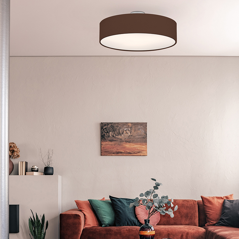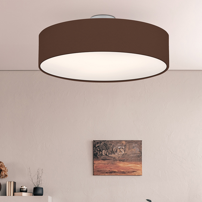 Осветително тяло - стилен и модерен плафон, изработен от метална основа, текстилен абажур и PVC разсейвател. Плафонът свети нагоре, встрани и надолу. Дизайнът на плафона е семпъл, което го прави подходящ за всеки интериор. Лампата се инсталира на тавана, като не се изисква сглобавяне, единствено трябва да премахнете защитното фолио на разсейвателя и да го поставите в плафона. Плафонът за всекидневна, осветление за детска стая, осветление за кухня, осветление за коридор, осветление за заведение, осветление за хотел. Производител CoupLight, България.