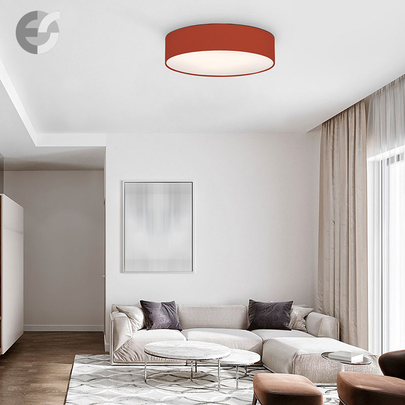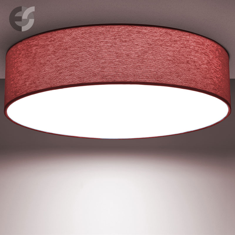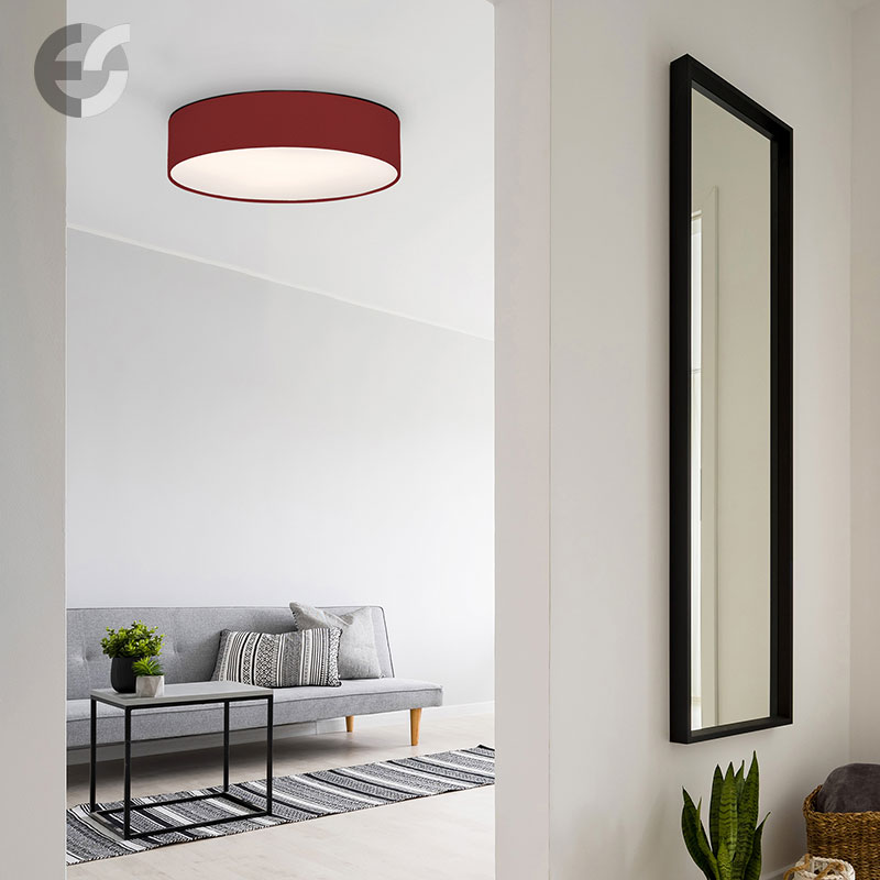 Осветително тяло - стилен и модерен плафон, изработен от метална основа, текстилен абажур в тъмночервен цвят и PVC разсейвател. Дизайнът на плафона е семпъл, което го прави подходящ за всеки интериор. Лампата се инсталира на тавана, като не се изисква сглобавяне, единствено трябва да премахнете защитното фолио на разсейвателя и да го поставите в плафона. Плафонът за всекидневна, осветление за детска стая, осветление за кухня, осветление за коридор, осветление за заведение, осветление за хотел. Производител CoupLight, България.