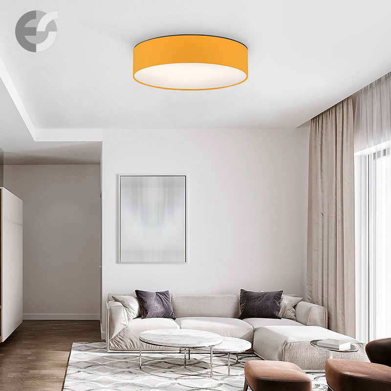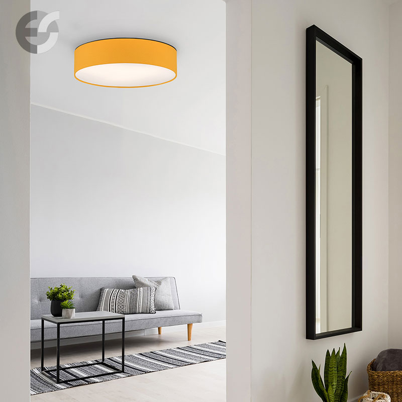 Осветително тяло - стилен и модерен плафон, изработен от метална основа, текстилен абажур в жълт цвят и PVC разсейвател. Дизайнът на плафона е семпъл, което го прави подходящ за всеки интериор. Лампата се инсталира на тавана, като не се изисква сглобавяне, единствено трябва да премахнете защитното фолио на разсейвателя и да го поставите в плафона. Плафонът за всекидневна, осветление за детска стая, осветление за кухня, осветление за коридор, осветление за заведение, осветление за хотел. Производител CoupLight, България.