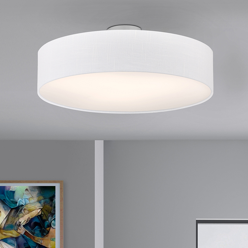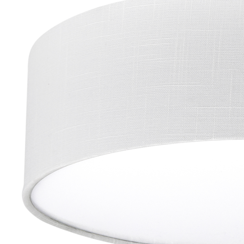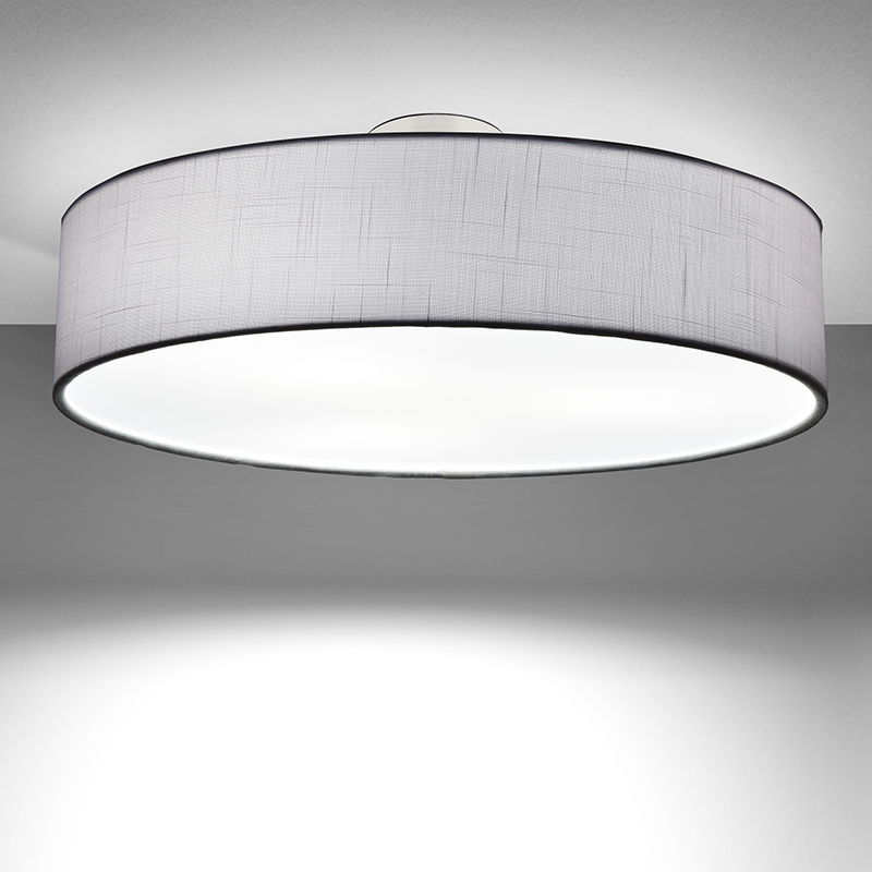 Осветително тяло - стилен и модерен плафон, изработен от метална основа, текстилен абажур и PVC разсейвател. Плафонът свети нагоре, встрани и надолу. Дизайнът на плафона е семпъл, което го прави подходящ за всеки интериор. Лампата се инсталира на тавана, като не се изисква сглобавяне, единствено трябва да премахнете защитното фолио на разсейвателя и да го поставите в плафона. Плафонът за всекидневна, осветление за детска стая, осветление за кухня, осветление за коридор, осветление за заведение, осветление за хотел. Производител CoupLight, България.