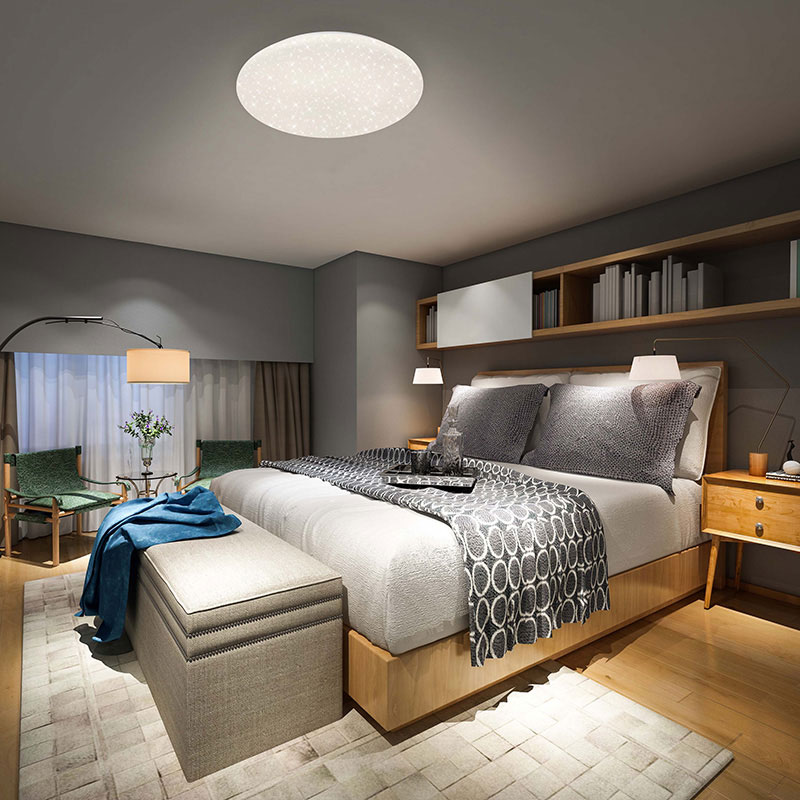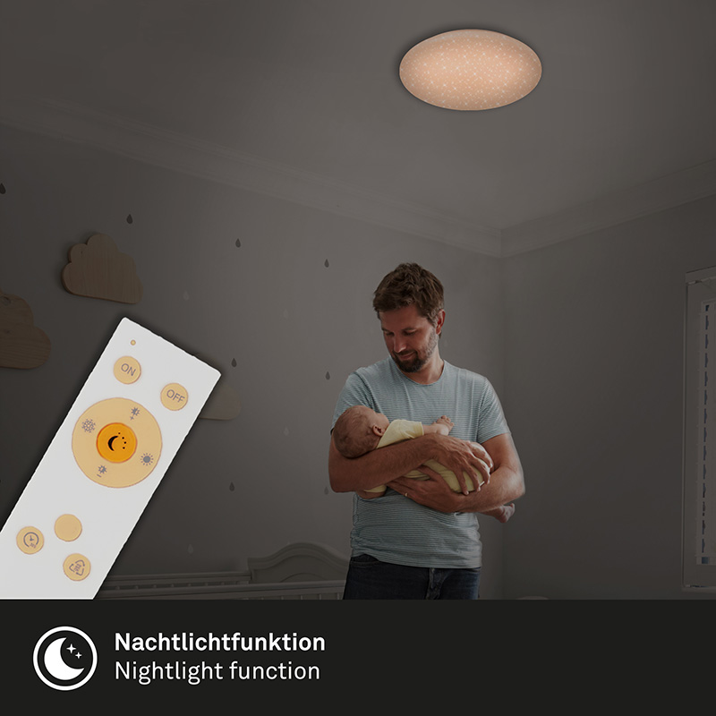LED плафон VERB CCT, изработен от метална рамка и пластмасов разсейвател в бяло, с ефект звездно небе. Плафонът е с включено в комплекта дистанционно. Лесно и удобно включвайте и изключвайте осветлението; променяйте цвета на светлината от топла (3000K) към студена (6500К); регулирайте силата на светене от слабa към силнa светлина и обратното; изпозлвайте функцията за нощен режим. Дизайнът на осветителното тяло е подходящ за осветление за всекидневна, осветление за коридор, осветление за спалня. Производител BRILO, Германия.