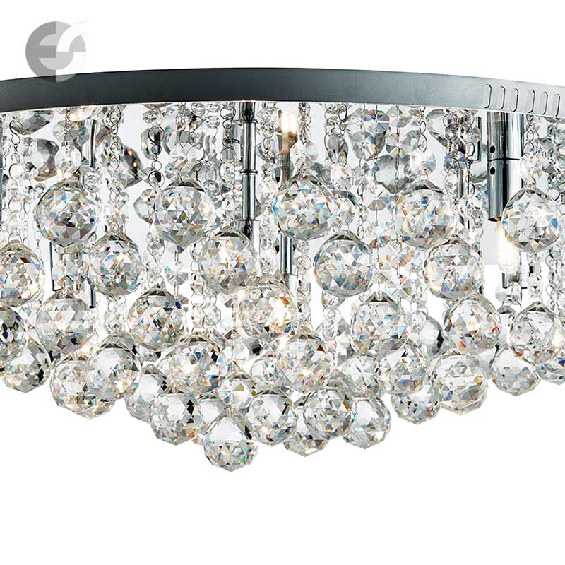 Осветително тяло - плафон, изработен от метал с покритие от хром и кристали. Артикулът е от серия осветителни тела HANNA на производител SEARCHLIGHT, Англия. Дизайнът е луксозен, подходящ за всекидневна, коридор, хотели и изискани ресторанти.