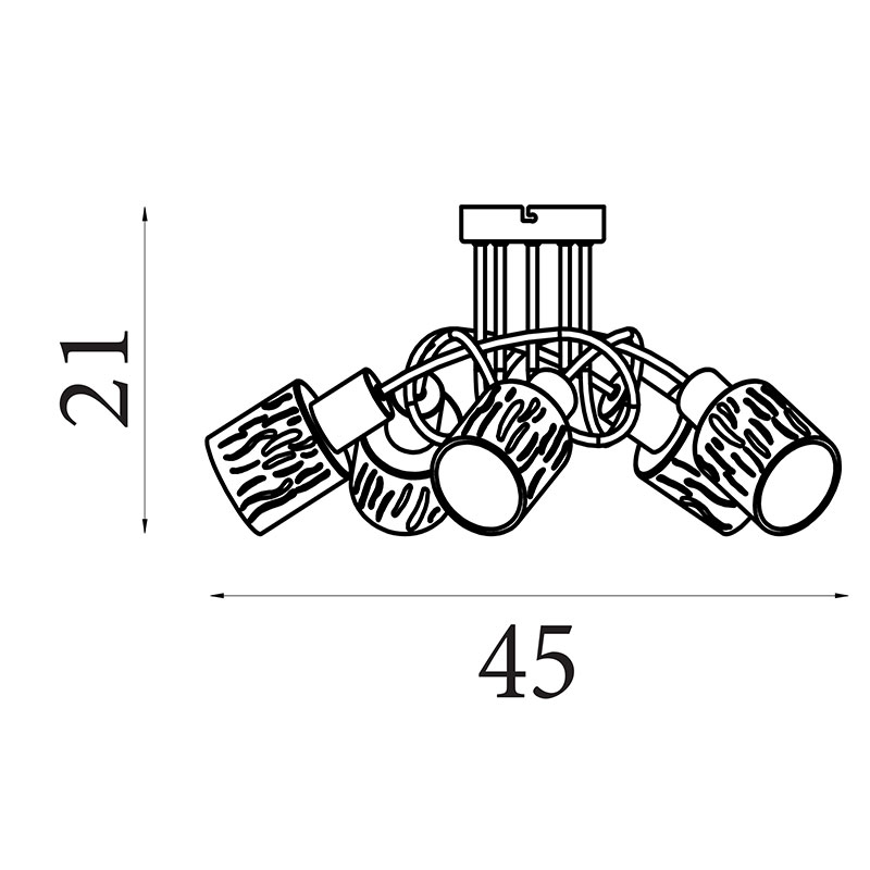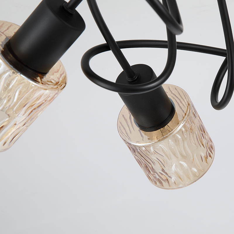 Петте стъклени абажура в топъл кехлибарен (amber) цвят омекотяват светлината и създават уютна атмосфера в помещението. Релефната текстура на стъклото допринася за интересен светлинен ефект, а възможността за димиране чрез стенен димер позволява лесно адаптиране на осветлението според настроението и нуждите. Моделът се предлага без включени 5xE14 крушки, давайки свобода при избора на подходящи светлоизточници.