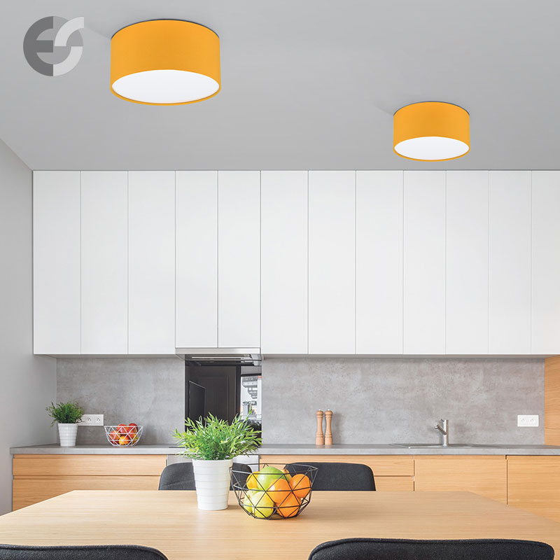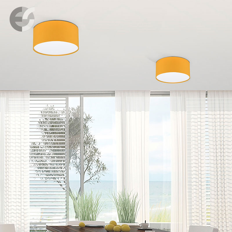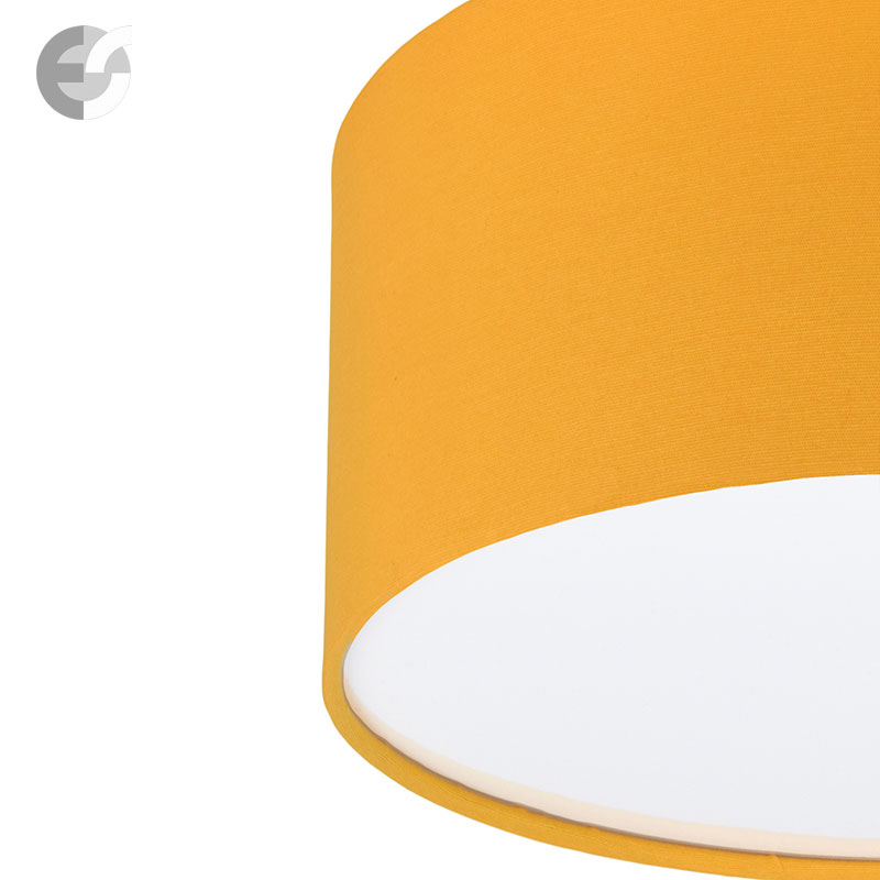 Осветително тяло - стилен и модерен плафон, изработен от метална основа, текстилен абажур в жълт цвят и PVC разсейвател. Дизайнът на плафона е семпъл, което го прави подходящ за всеки интериор. Лампата се инсталира на тавана, като не се изисква сглобавяне, единствено трябва да премахнете защитното фолио на разсейвателя и да го поставите в плафона. Плафонът за всекидневна, осветление за детска стая, осветление за кухня, осветление за коридор, осветление за заведение, осветление за хотел. Производител CoupLight, България.
