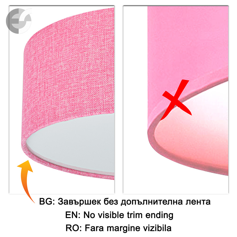 Осветително тяло - стилен и модерен плафон, изработен от метална основа, текстилен абажур, тип мрежа в розов цвят и PVC разсейвател. Дизайнът на плафона е семпъл, което го прави подходящ за всеки интериор. Лампата се инсталира на тавана, като не се изисква сглобавяне, единствено трябва да премахнете защитното фолио на разсейвателя и да го поставите в плафона. Плафонът за всекидневна, осветление за детска стая, осветление за кухня, осветление за коридор, осветление за заведение, осветление за хотел. Производител CoupLight, България.
