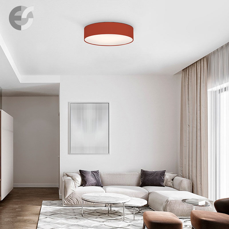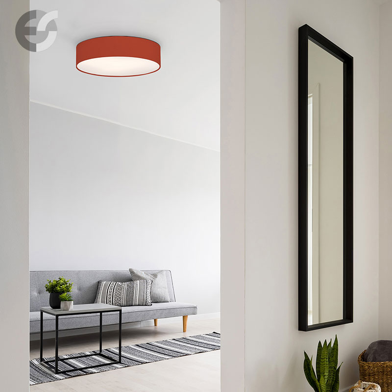 Осветително тяло - стилен и модерен плафон, изработен от метална основа, текстилен абажур в цвят керемиденочервено и PVC разсейвател. Дизайнът на плафона е семпъл, което го прави подходящ за всеки интериор. Лампата се инсталира на тавана, като не се изисква сглобавяне, единствено трябва да премахнете защитното фолио на разсейвателя и да го поставите в плафона. Плафонът за всекидневна, осветление за детска стая, осветление за кухня, осветление за коридор, осветление за заведение, осветление за хотел. Производител CoupLight, България.