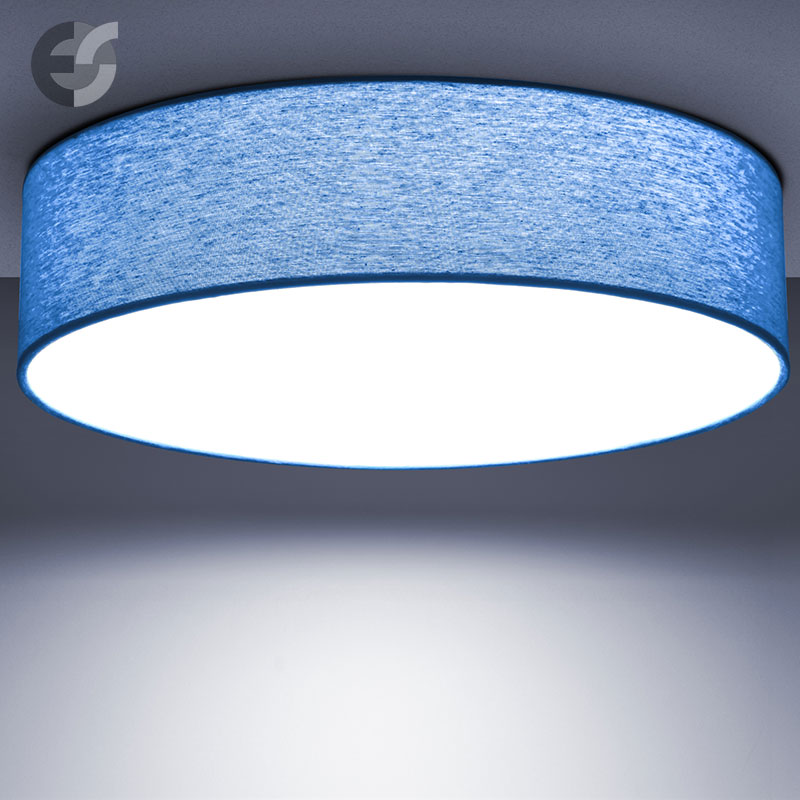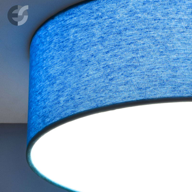 Осветително тяло - стилен и модерен плафон, изработен от метална основа, текстилен абажур в светлосин цвят и PVC разсейвател. Дизайнът на плафона е семпъл, което го прави подходящ за всеки интериор. Лампата се инсталира на тавана, като не се изисква сглобавяне, единствено трябва да премахнете защитното фолио на разсейвателя и да го поставите в плафона. Плафонът за всекидневна, осветление за детска стая, осветление за кухня, осветление за коридор, осветление за заведение, осветление за хотел. Производител CoupLight, България.