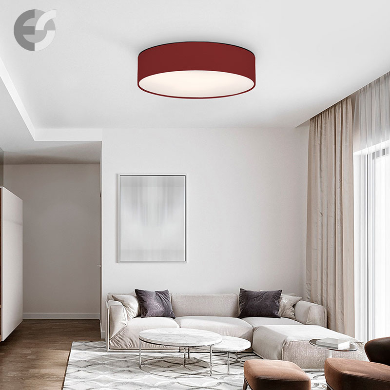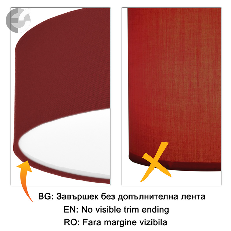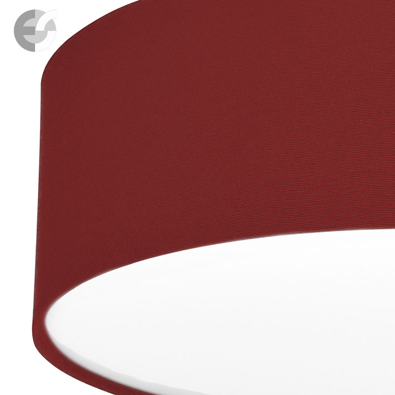 Осветително тяло - стилен и модерен плафон, изработен от метална основа, текстилен абажур в тъмночервен цвят и PVC разсейвател. Дизайнът на плафона е семпъл, което го прави подходящ за всеки интериор. Лампата се инсталира на тавана, като не се изисква сглобавяне, единствено трябва да премахнете защитното фолио на разсейвателя и да го поставите в плафона. Плафонът за всекидневна, осветление за детска стая, осветление за кухня, осветление за коридор, осветление за заведение, осветление за хотел. Производител CoupLight, България.