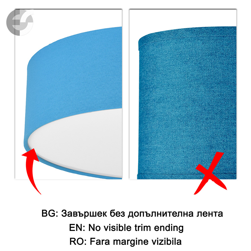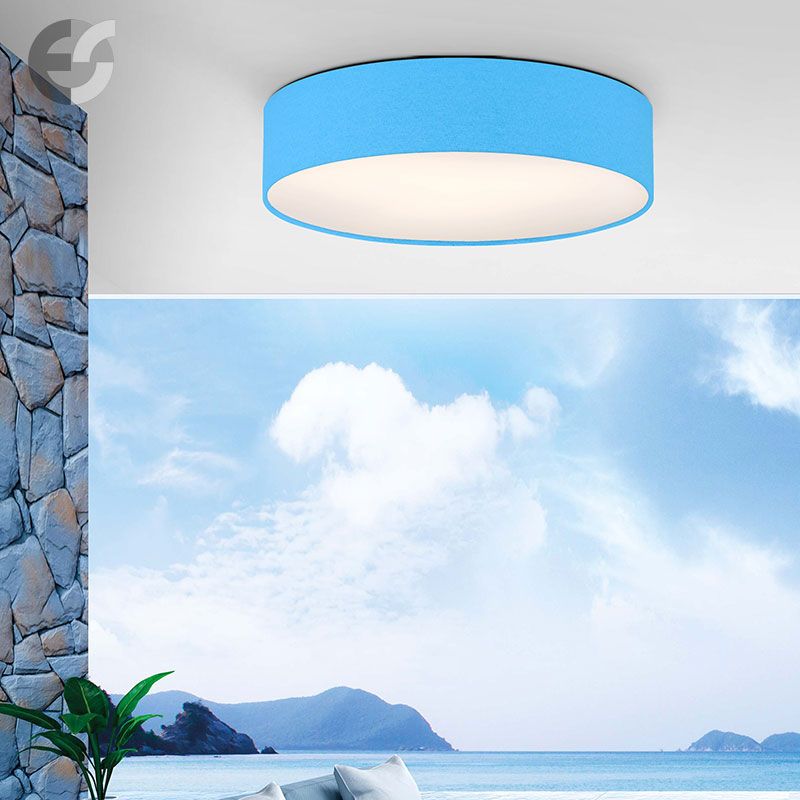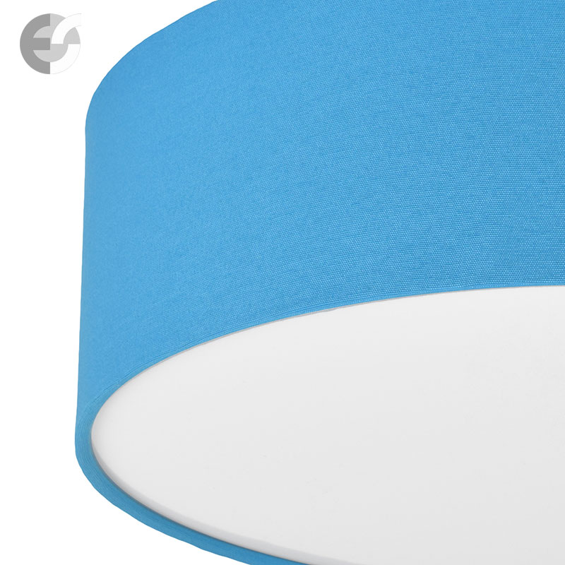 Осветително тяло - стилен и модерен плафон, изработен от метална основа, текстилен абажур в светлосин цвят и PVC разсейвател. Дизайнът на плафона е семпъл, което го прави подходящ за всеки интериор. Лампата се инсталира на тавана, като не се изисква сглобавяне, единствено трябва да премахнете защитното фолио на разсейвателя и да го поставите в плафона. Плафонът за всекидневна, осветление за детска стая, осветление за кухня, осветление за коридор, осветление за заведение, осветление за хотел. Производител CoupLight, България.