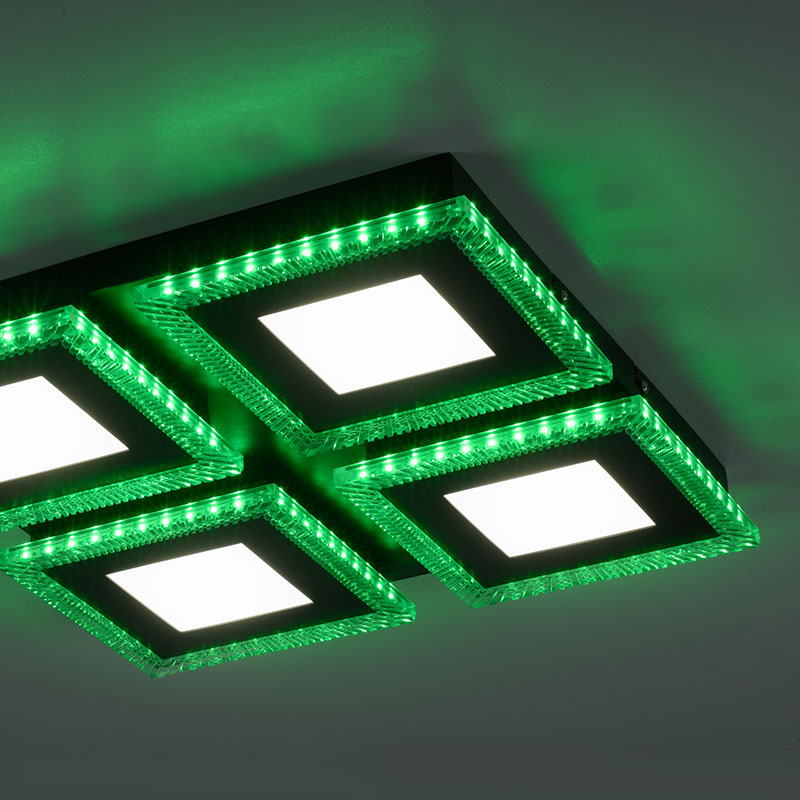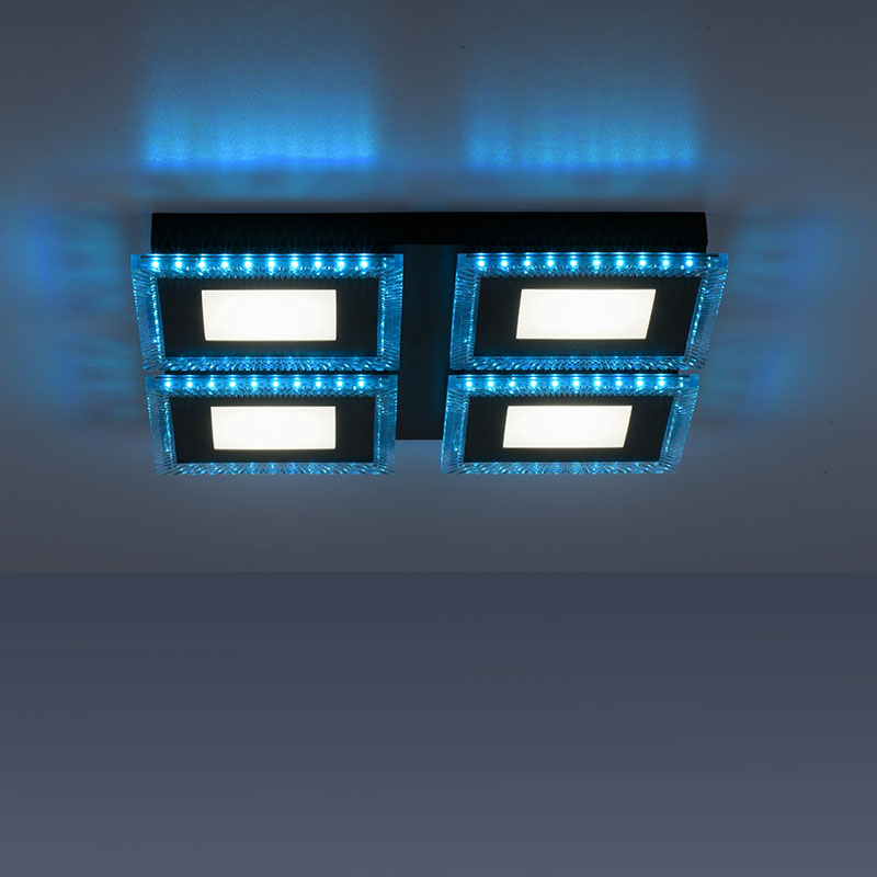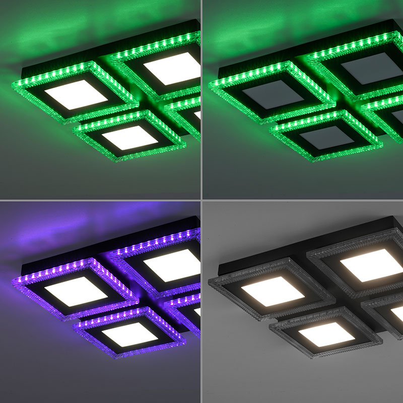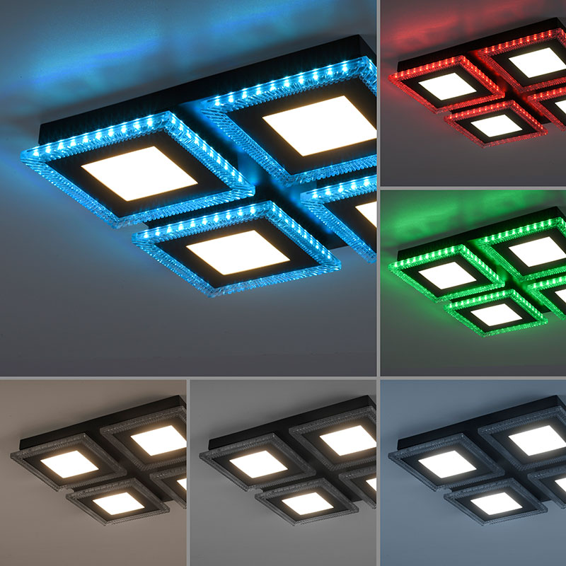 Осветително тяло - RGB LED Плафон Acri, изработен от метал в черен цвят и разсейвател от прозрачен акрил. Плафонът може да бъде монтиран и като аплик на стената. Лампата може да бъде управлявана чрез дистанционното като можете лесно и удобно да регулирате цветната температура на светлината - от топло бяла към неутрална (дневна) и обратно; силата на светене -силно или слабо; да настроите таймер за изключване; бутон за нощен режим (10% светлина); бутон за любими настройки на светлината; да изберете цвят от RGB модула. Дизайнът на осветителното тяло е подходящ за осветление за всекидневна, осветление за кухня, осветление за коридор, осветление за спалня. Производител Leuchten Direkt, Германия.