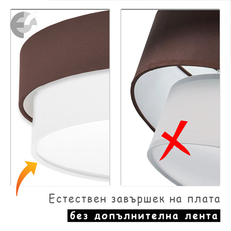 Осветително тяло - плафон CAKE, изработен от метална основа, два текстилни абажура и бял PVC разсейвател. Плафонът се предлага в над 50 различни комбинации от цветове. Изберете най-подходящата за вас комбинация от цветове и добавете към всяка стая модерен акцент и светлина. Осветителното тяло е подходящо за осветление на спалня, осветление за всекидневна, осветление за детска стая, осветление за кухня, осветление за коридор.